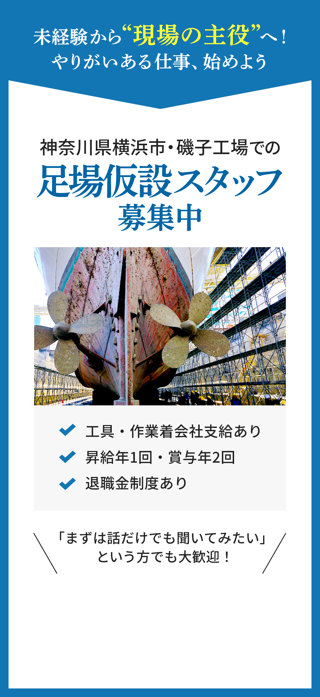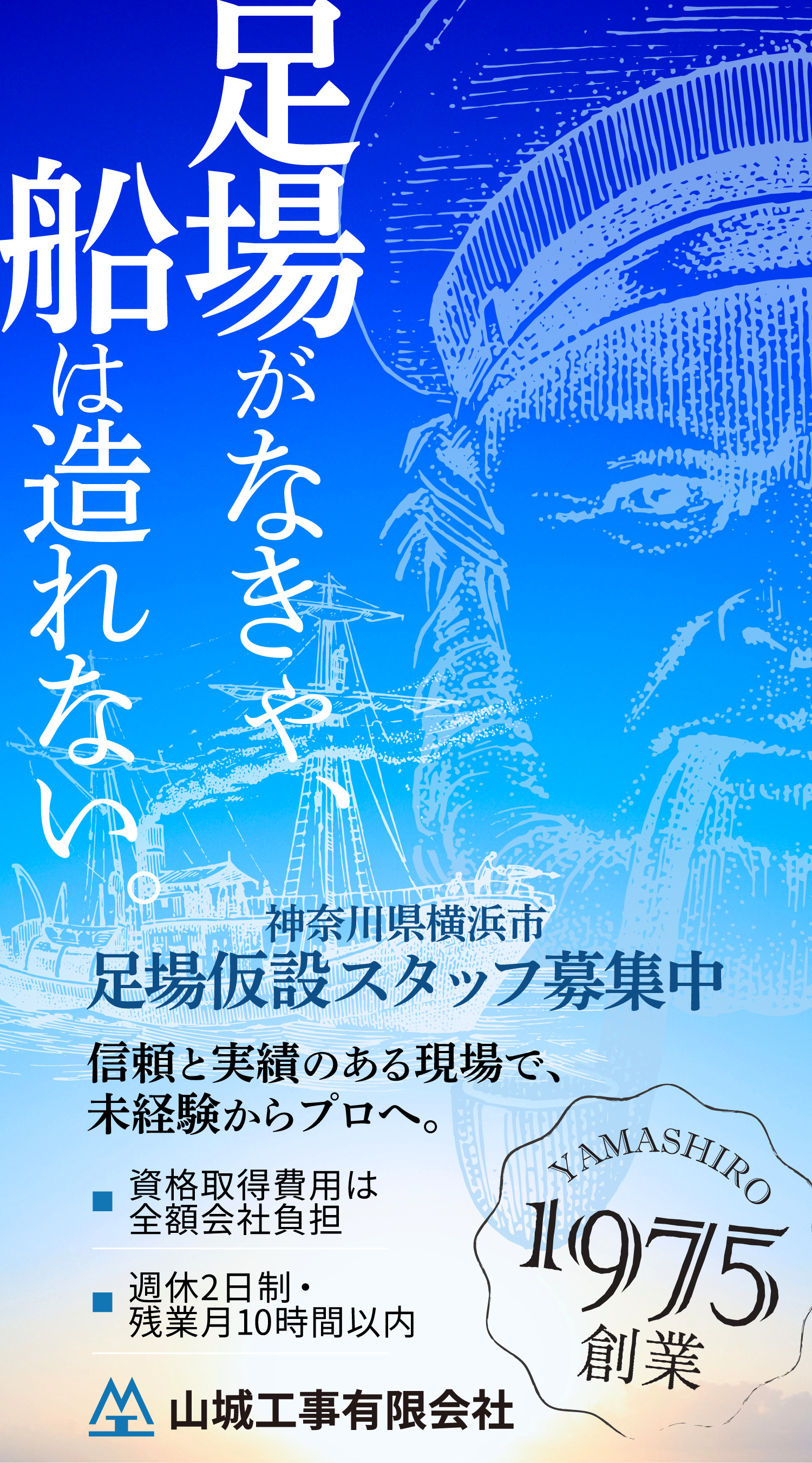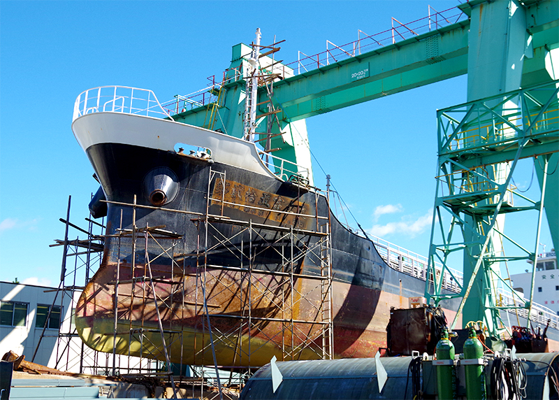 造船所で行われる船の建造工事。その安全を支えているのが、私たち足場仮設スタッフです。一般的な建設現場の足場とは異なり、船の複雑な形状に合わせた特殊な足場を組み立てる技術が求められます。